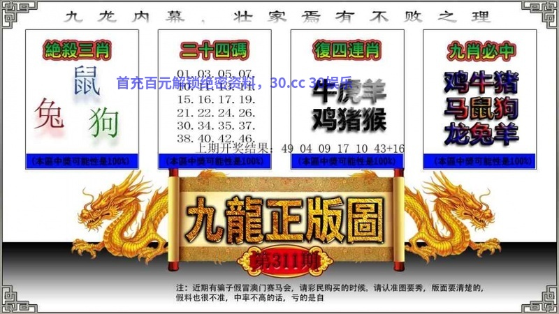| 311期:九肖 | 猪兔狗鸡蛇猴牛马龙 | 开:蛇37中 |